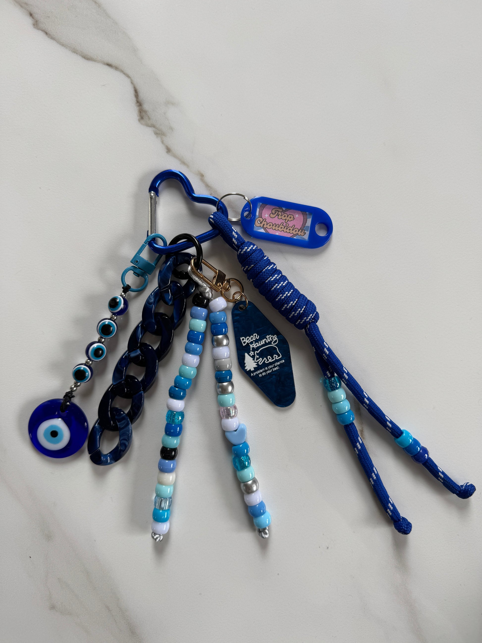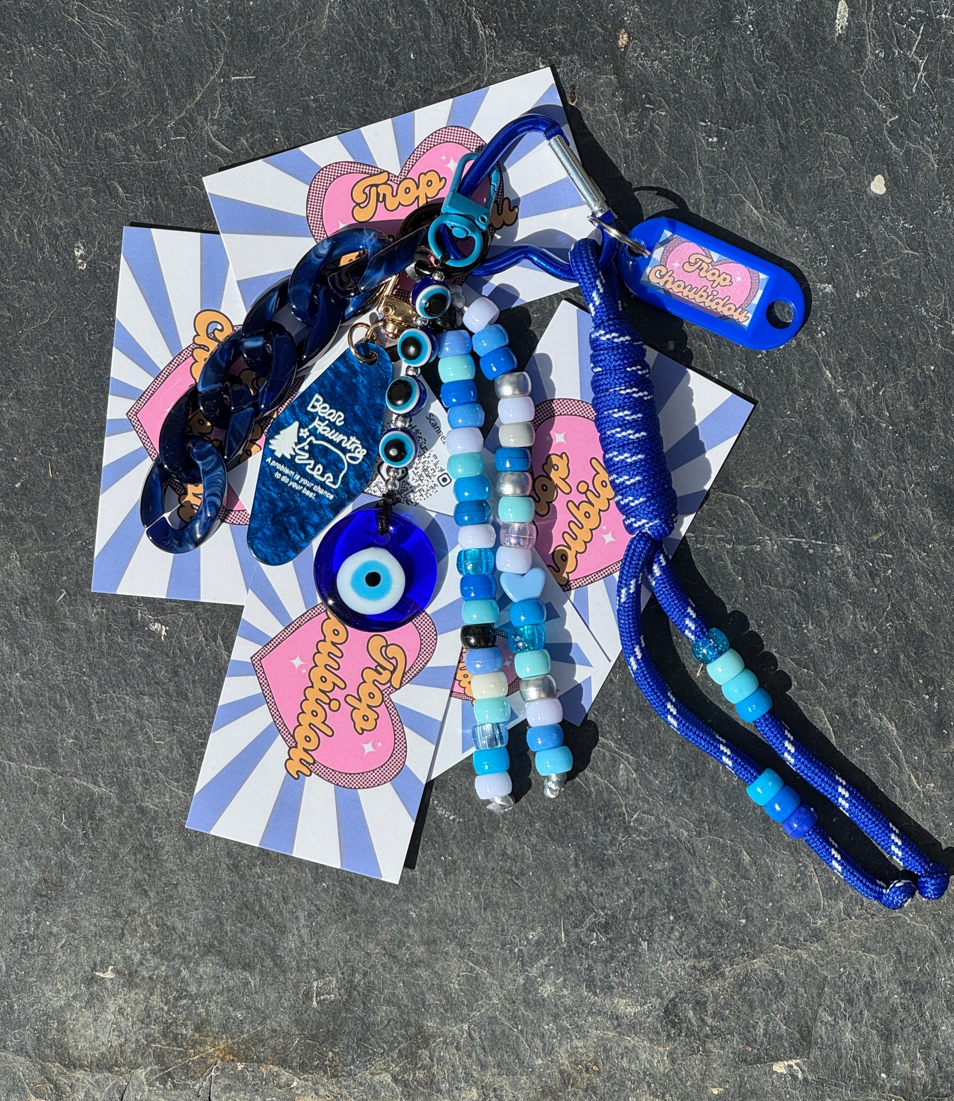 Un grigri puissant et stylé, inspiré des symboles de protection, des vacances en bord de mer et des petits porte-bonheur qu’on accroche à son sac comme des secrets à garder. Sa palette de bleus profonds mêle spiritualité, fraîcheur et énergie graphique.