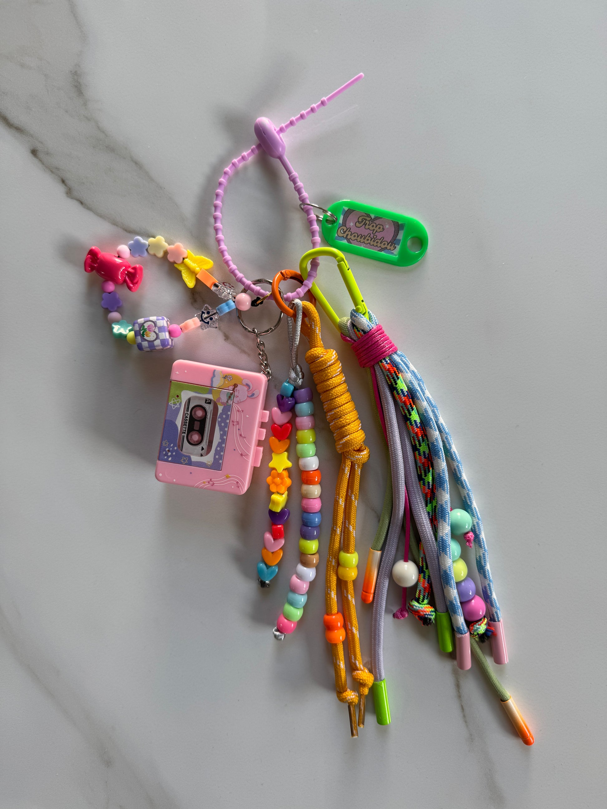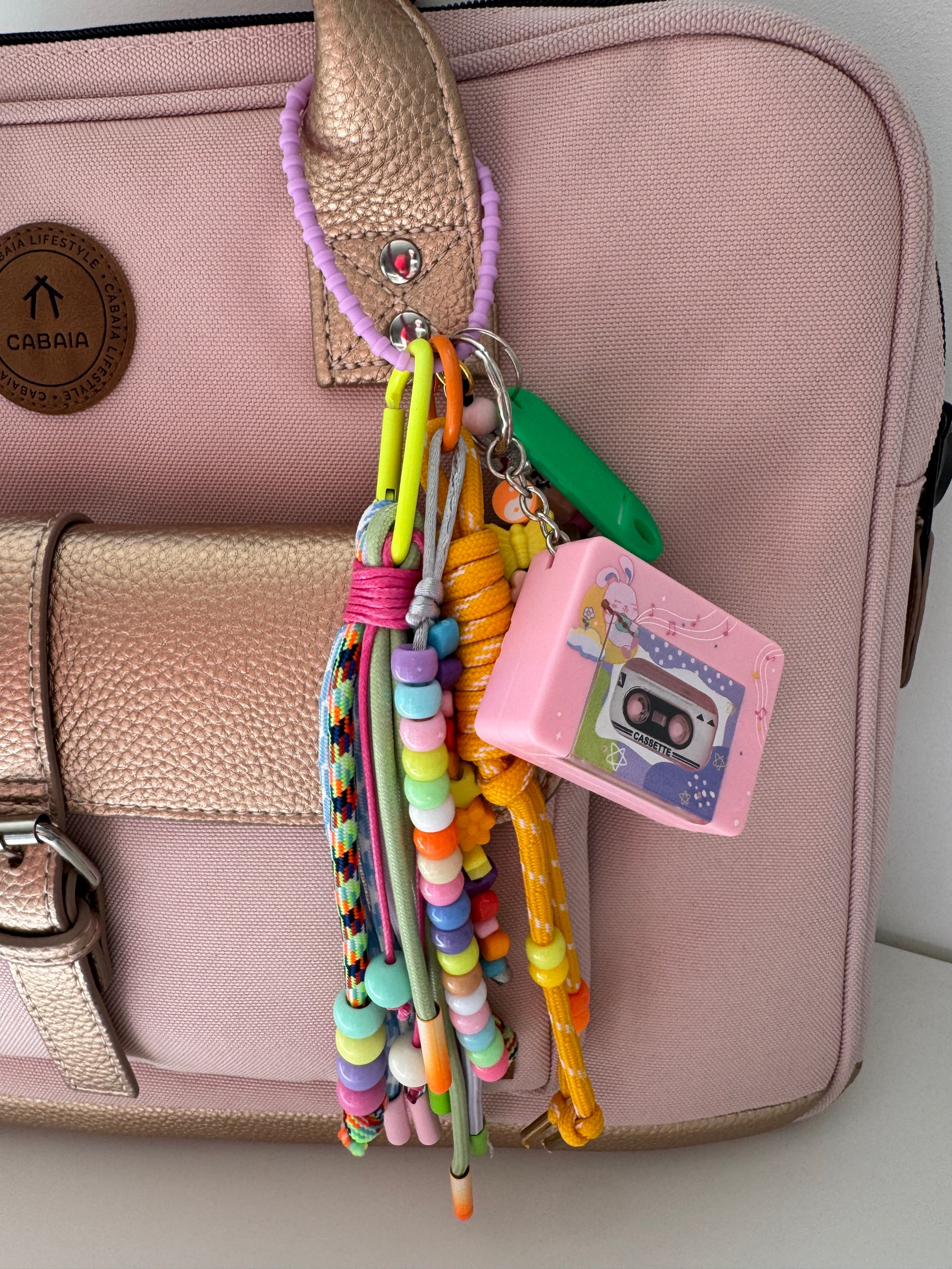 Un bijou de sac joyeux et rétro qui mêle esprit ludique et charme nostalgique. Avec ses détails acidulés et son mini Walkman factice, ce grigri unique revisite les accessoires d’enfance pour les transformer en petits talismans modernes et colorés.