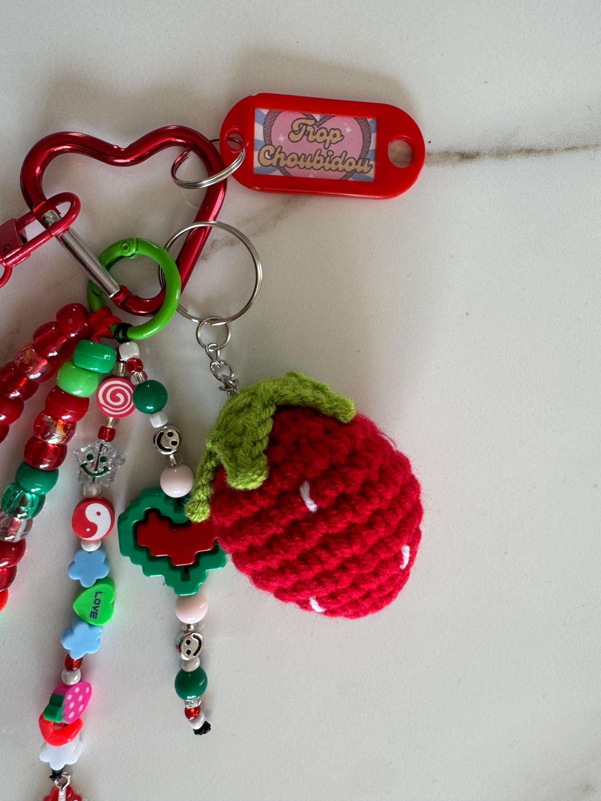 • Mousqueton en forme de cœur rouge : attache brillante et originale, qui s’accroche partout.