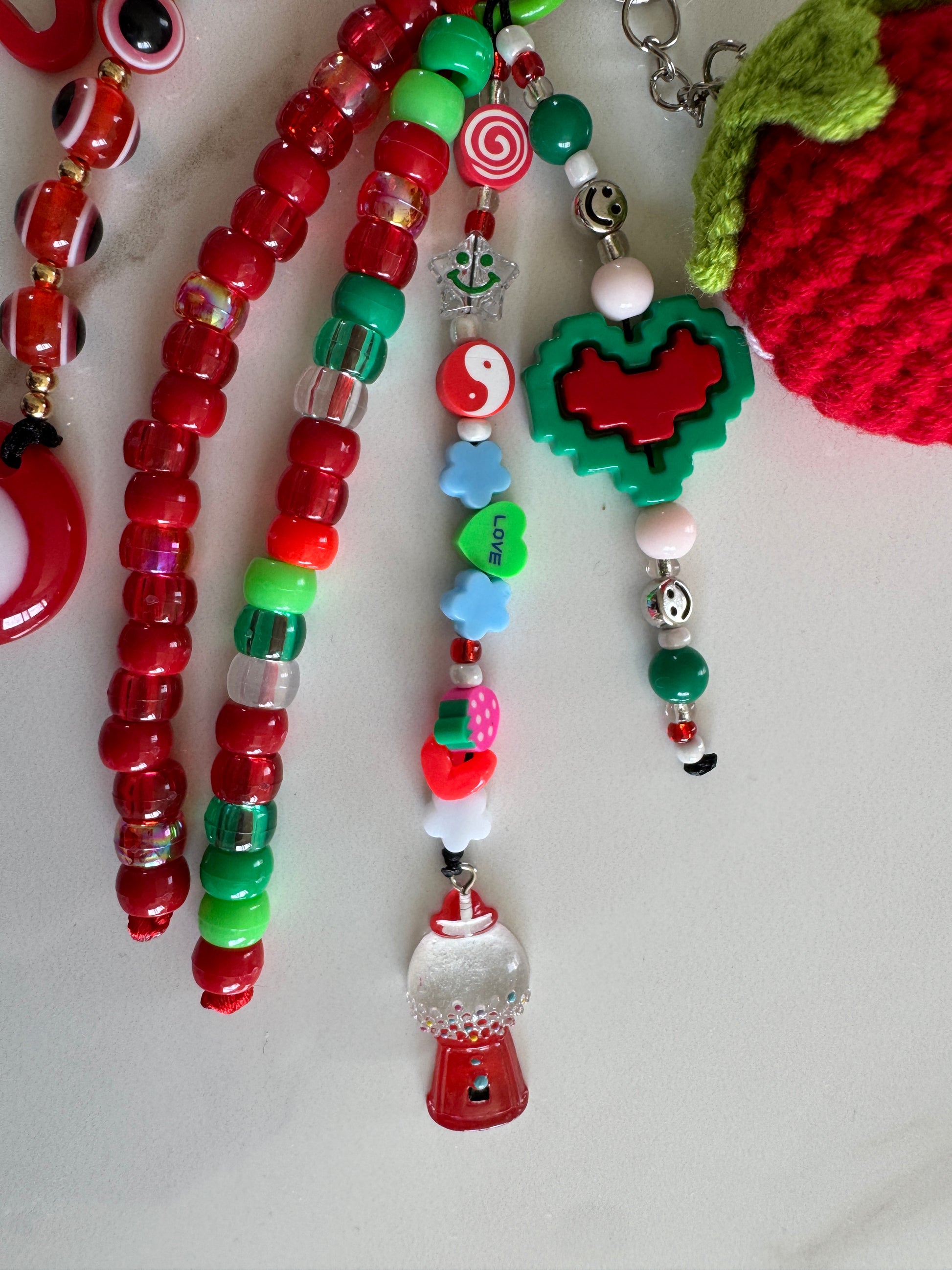 • Charms fantaisie : bonbon spiralé, cœur pixelisé, smiley, yin-yang, lettre “LOVE”, étoile pastel, et une machine à bonbons en pendentif trop mignonne.