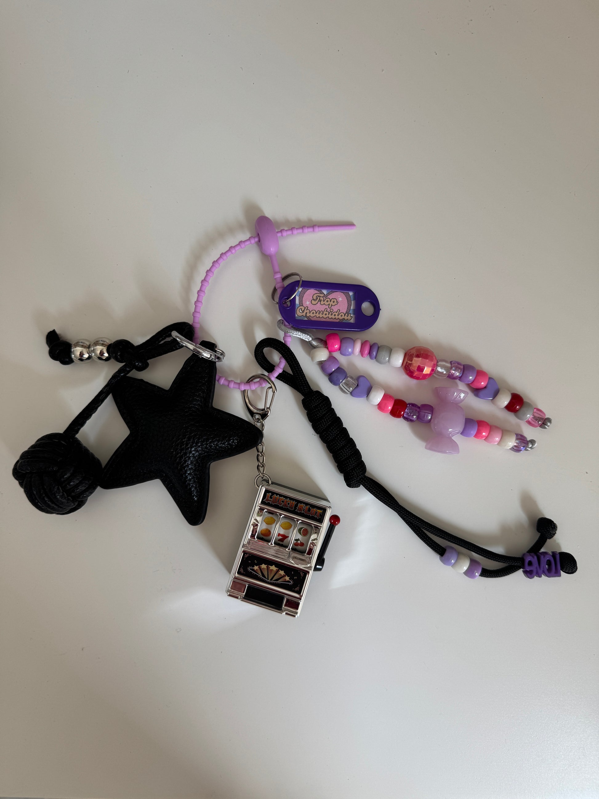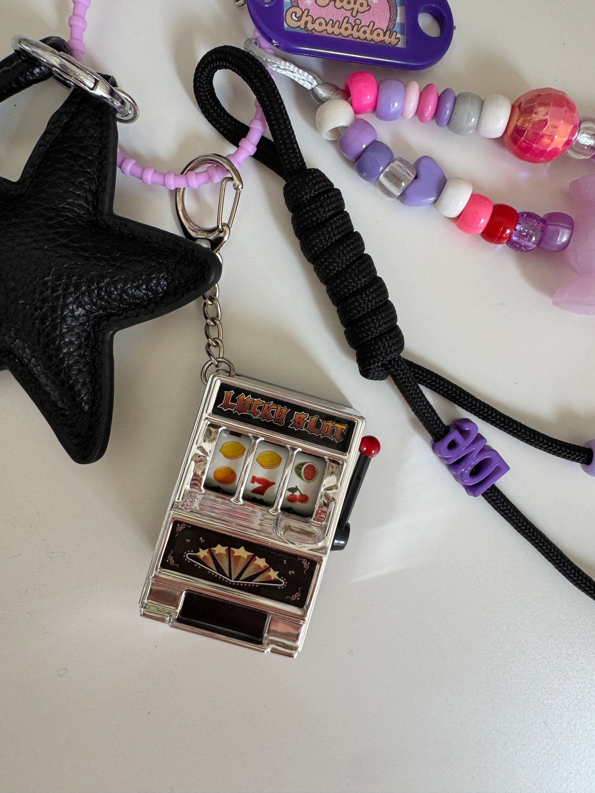 Un bijou de sac espiègle et vibrant, inspiré des nuits lumineuses de Vegas et des années 2000. Avec sa machine à sous miniature, ses perles brillantes et son étoile noire moelleuse, ce grigri joue avec les codes du kitsch et du kawaii pour créer un accessoire porte-bonheur plein de caractère.