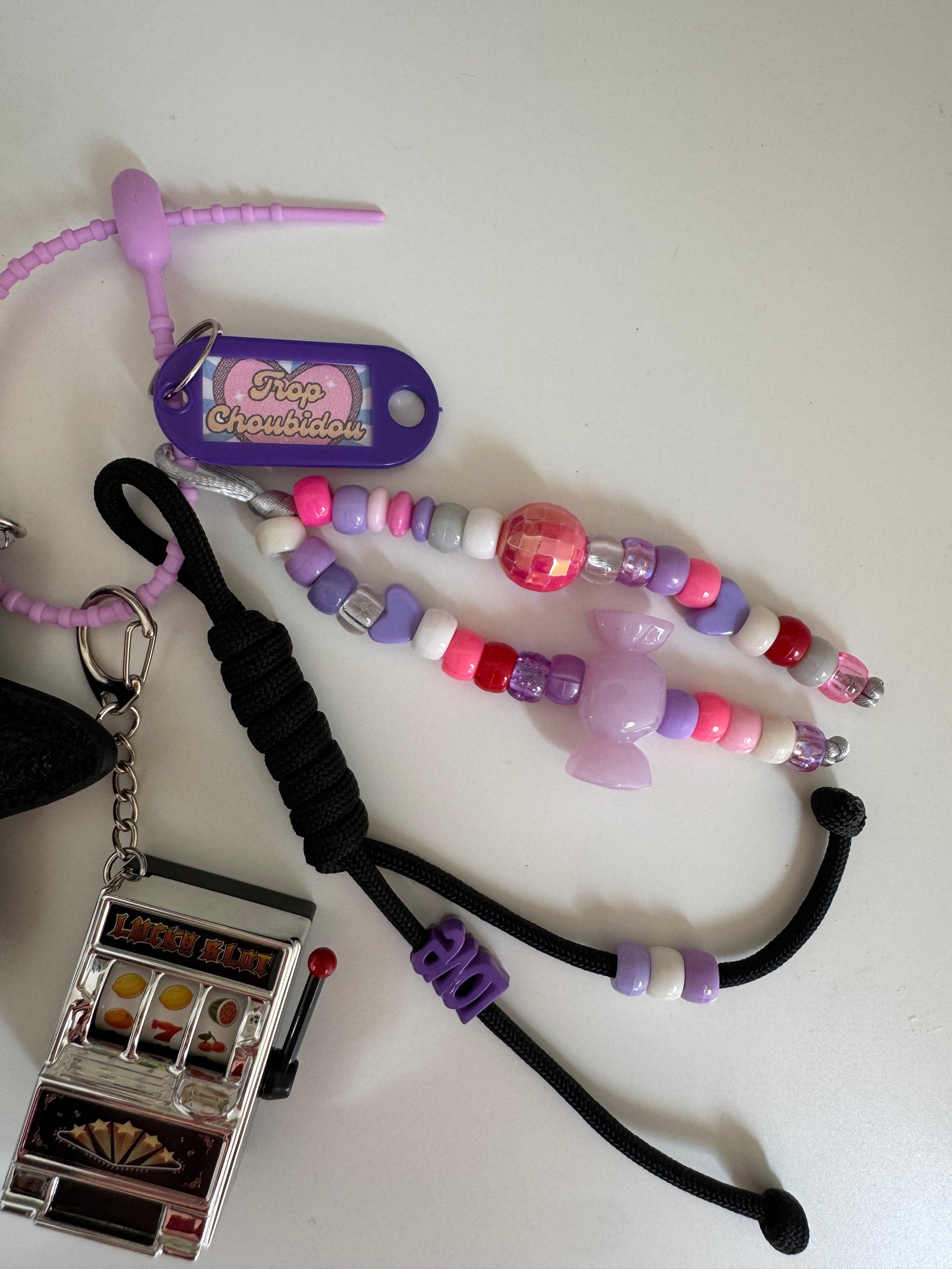• Perles fantaisie roses, lilas et blanches : mélange de cœurs, perles classiques, boule à facettes et une perle bonbon violet façon gélifié, pour une touche pop et sucrée