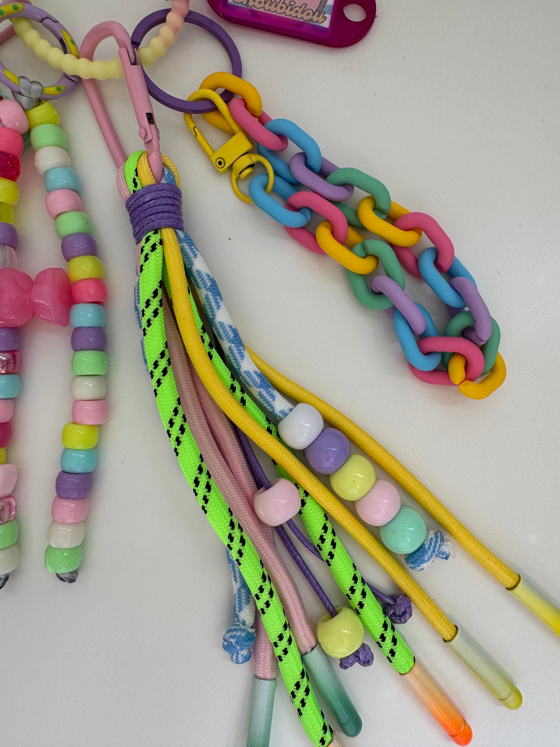 • Multi-cordons colorés : réunis sur un mousqueton violet, accompagnés de perles colorées en enfilade pour une finition graphique et fun.