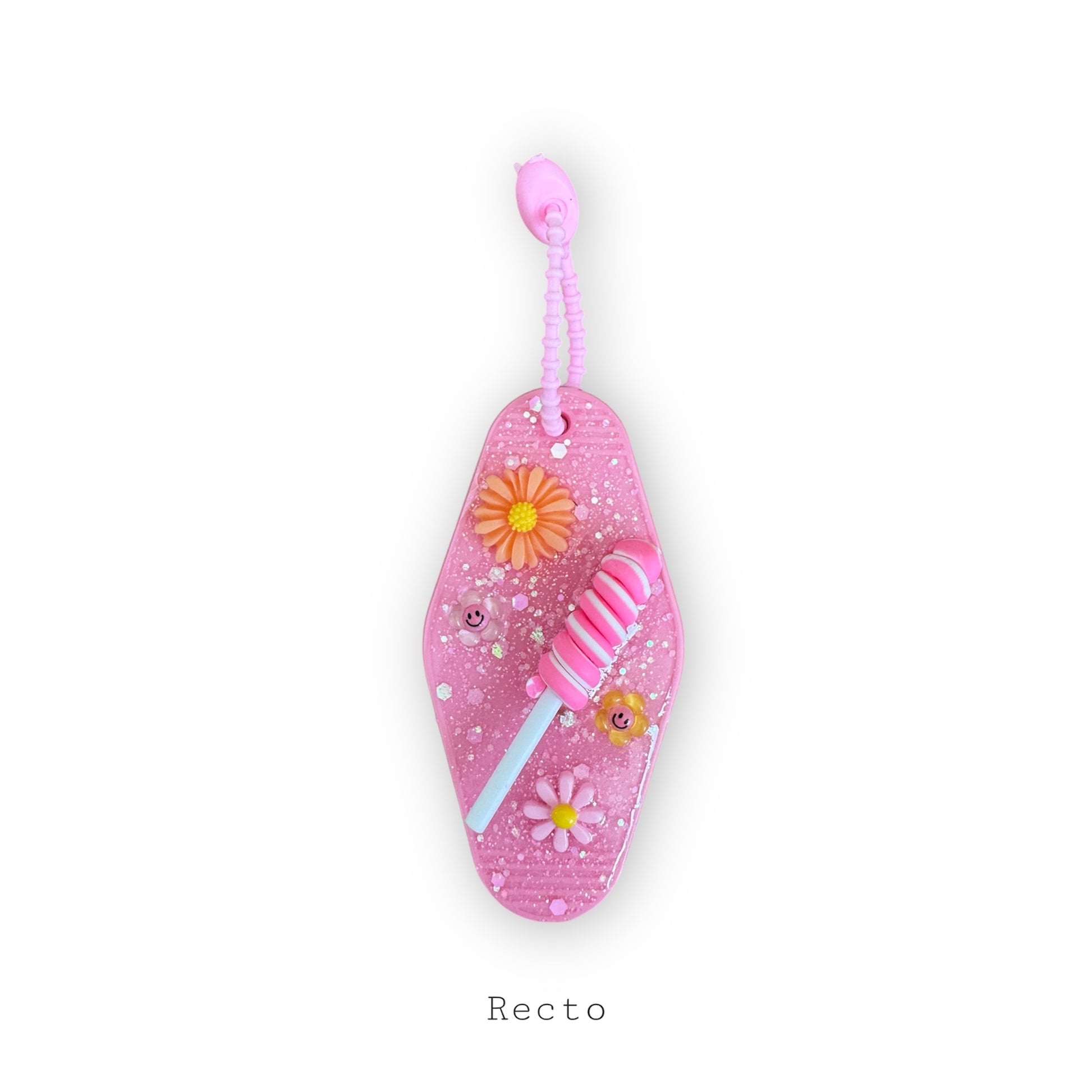 Ce grigri façon plaque motel est décoré à la main avec une couche de résine brillante, des fleurs en relief, des smileys et une sucette rose : le tout pour un résultat sucré, fun et kawaï à souhait.